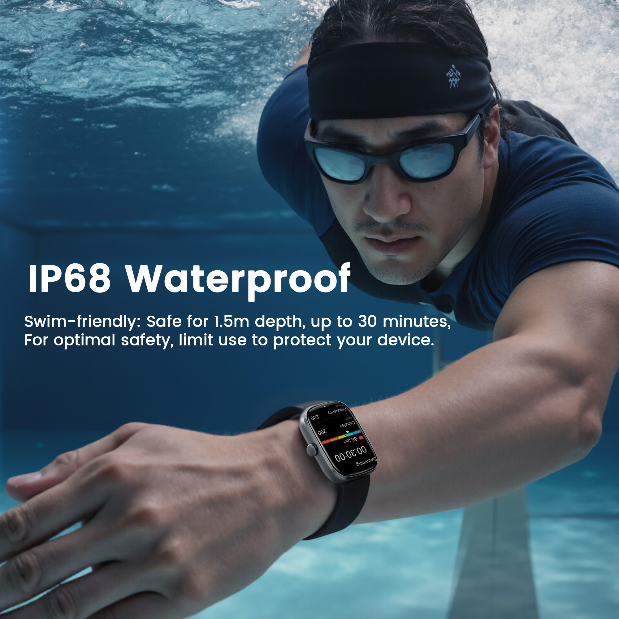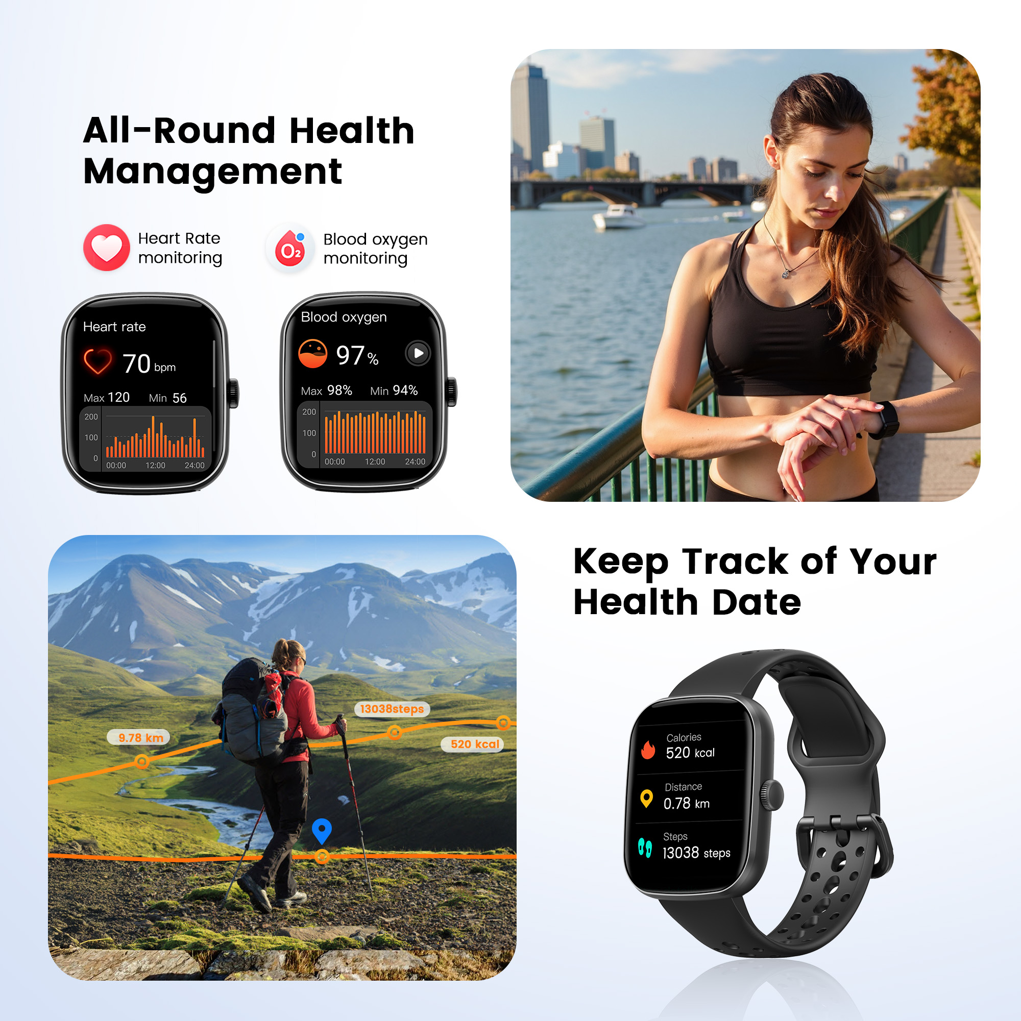 110+ Sports Modes and IP68 Waterproof: The fitness tracker comes with 110+ sports modes such as running, swimming, cycling, hiking, yoga, basketball, and more. Whether you're indoors or outdoors, this smartwatch accurately tracks your steps, distance, calories burned, and more in real-time. With an IP68 waterproof rating, it is ideal for various water activities, including swimming and washing hands, without the worry of water damage. Keep track of your daily fitness goals and get a complete picture of your activity levels throughout the day
